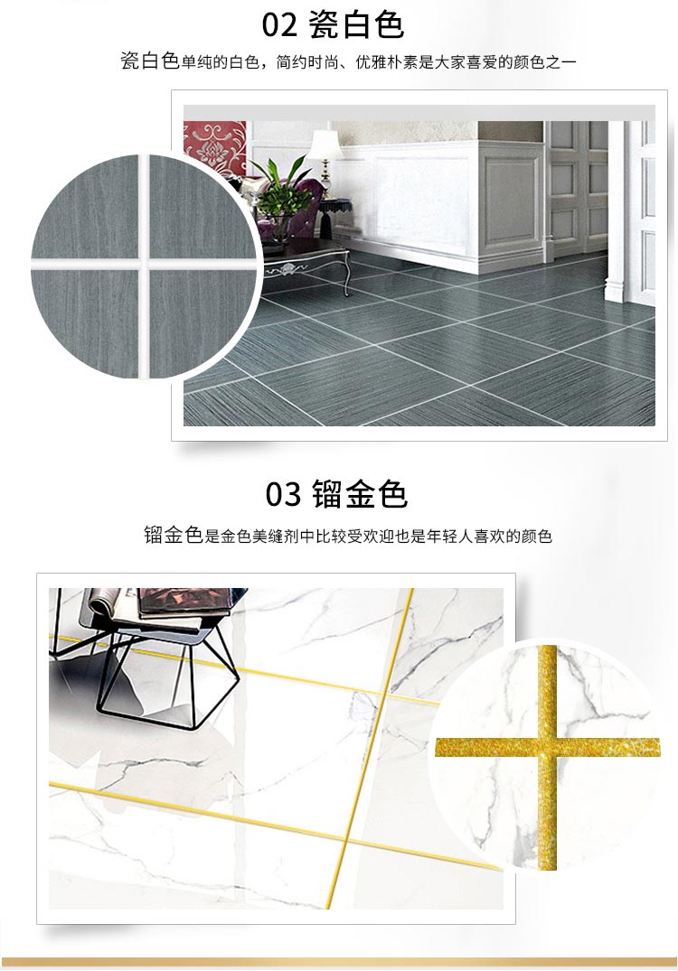 三、填缝剂:成份是白水泥及微量聚合物、颜料组成;白色的百度在86%左右,表层强度略高于白水泥;彩色填缝剂颜色较多,但都暗淡无光泽,一般配合仿古砖勾缝效果略好;对色彩亮丽、光泽度较高的瓷砖,尤其对锦砖、马赛克这些类型的砖缝款又多,使用彩色填缝剂远看明显影响墙地面整体效果,近看砖与缝的亮暗差别太大、不协调;彩色填缝剂施工时易污染瓷砖表面,进行清洗比较麻烦,多数只好选用白色填缝剂勾缝;彩色填缝剂使用后同白水泥一样砖缝很容易变脏,这就是人们常常在地砖勾缝时选用黑色填缝剂的原因,因为选用其他颜色的会很快变脏,并很难擦洗干净。